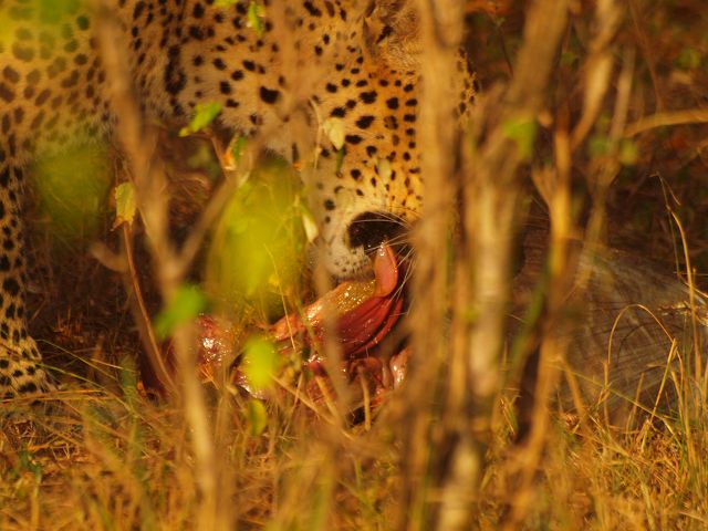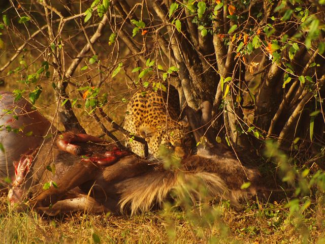 Kill der Leopardin Wildebeest Gnu genüsslich ißt Sie Ihr Frühstück