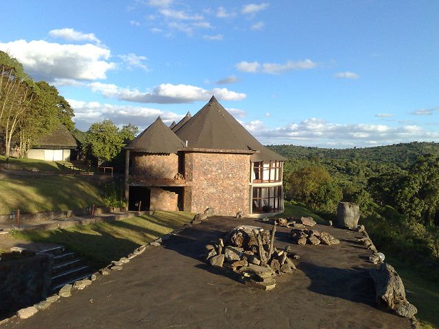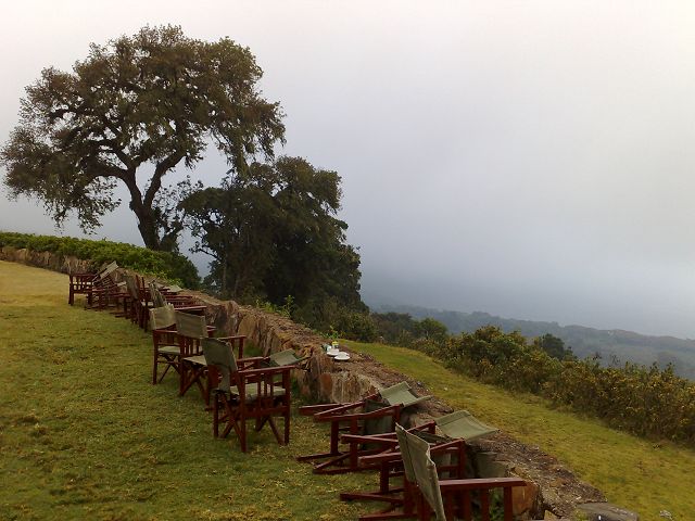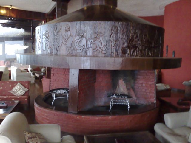 4 seitiger Kamin  Ngorongoro Sopa Lodge  Morgens in schon mal Nebel   Ngorongoro Sopa Lodge