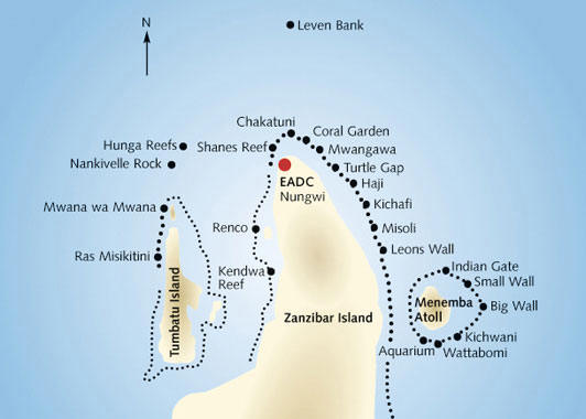 Eine riesige Korallenriff Struktur am nördlichsten Punkt Sansibars mit einer maximalen Tauchtiefe von 20 Metern. Dort findet man viele kleine Riff-Fische, sowie herrliche Korallen. Ein ideales Revier für Anfänger sowie erfahrene Taucher.