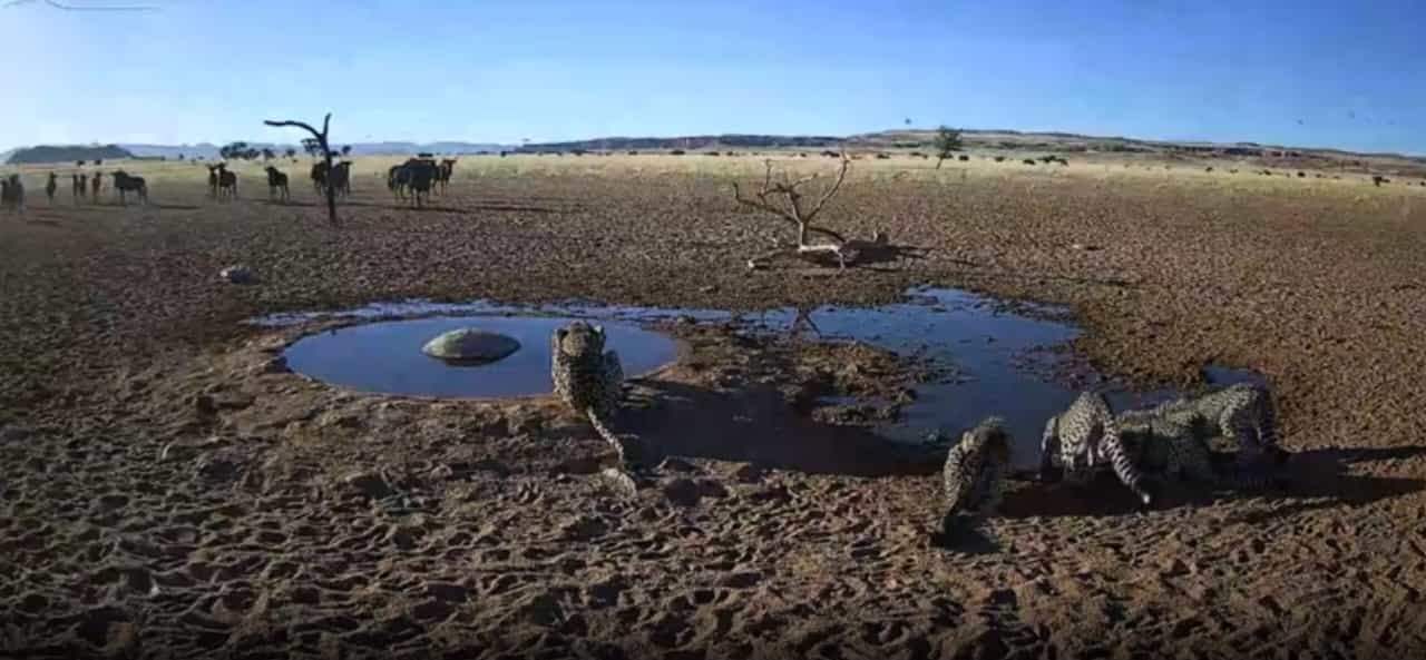 desertlodge Nambia 5 Cheetahs an dem Wasserloch