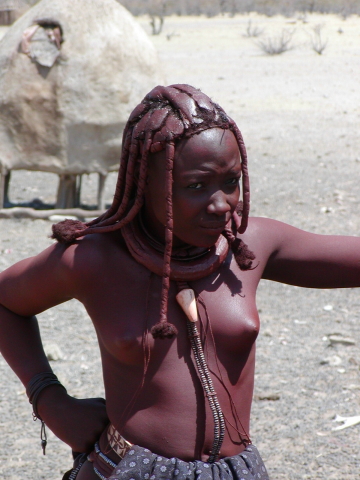 Merkmal der Himba Rötlich schimmernde Haut und Haare. Die Otjize-Paste wird aus Butterfett und Ockerpigment hergestellt , parfümiert mit dem Harz einer Myrrhenart, und schützt die Himba vor Sonne Mücken und Hautfalten