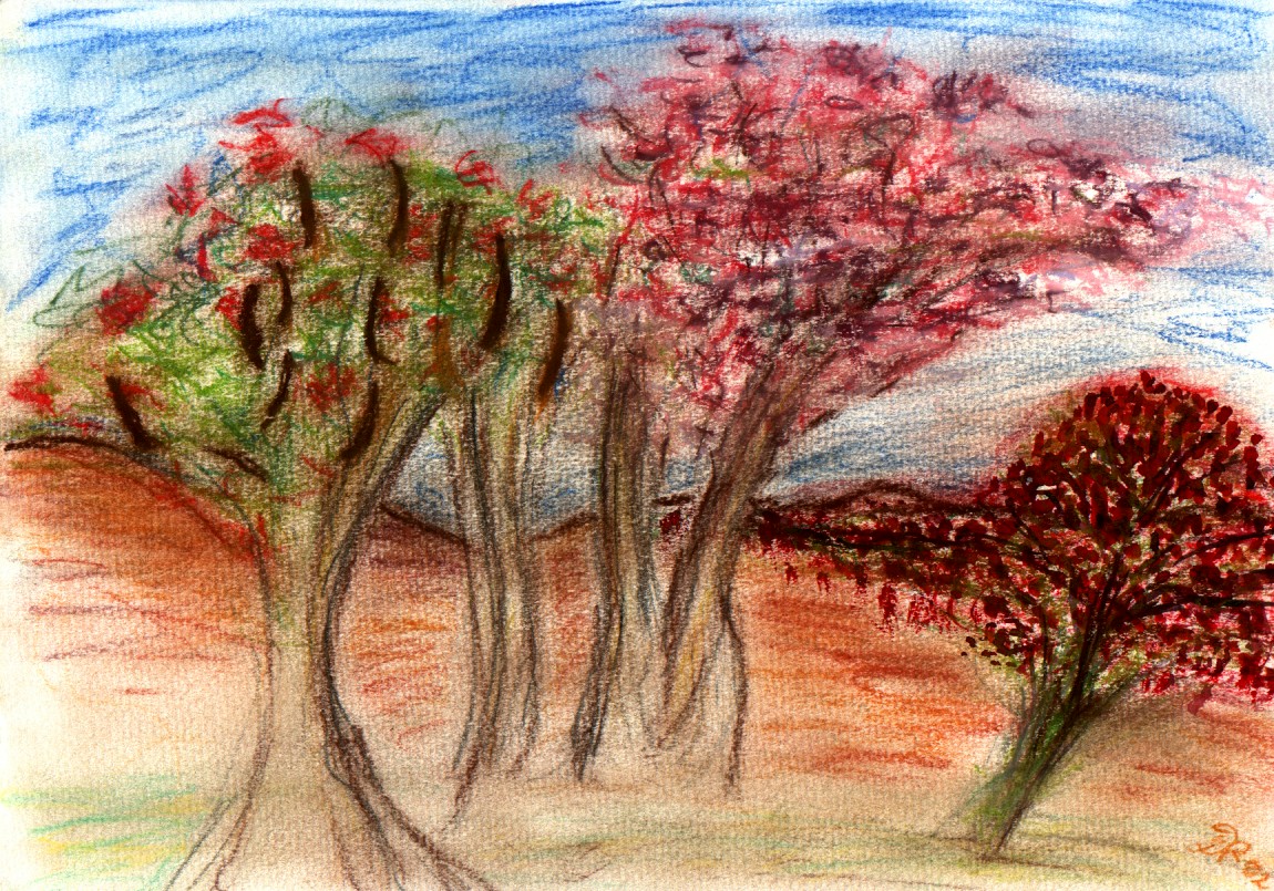 Ölkreideskizze Gemälde Tulpenbaum und Jacaranda