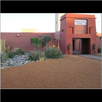 Als ob ein afrikanisches Reich alt, Damara Mopane Lodge befindet sich in einem Halbkreis von Verkettungs Wege führen zu einem reichhaltigen Pool in der Mitte errichtet. Innovativem Design hat jedes Chalet über einen eigenen kleinen Garten mit Gemüse bepflanzt. Leuchtend gelbe Sonnenblumen lugen aus zwischen grünen Spinat, Rote Bete und verrückten Vogelscheuchen, eine bezaubernde Lodge Einstellung zu schaffen. Das Labyrinth der Gänge führt zu einem großen und fröhlichen zentralen Bereich. Ein Wasch von frischen grünen hellt das Innere ebenso wie die herzförmigen Blätter Mopani in der Lodge stencilled. Das Hotel liegt in der Nähe von Khorixas auf dem Weg zu den berühmten Twyfelfontein Stiche, enthält Damara Mopane Lodge den Geist von Damaraland und die Damara, erweitert seine Hand auf Einheimische und Besucher gleichermaßen in einem "Hallo Nachbar" Gruß und verbindet Kulturen und Nationalitäten.