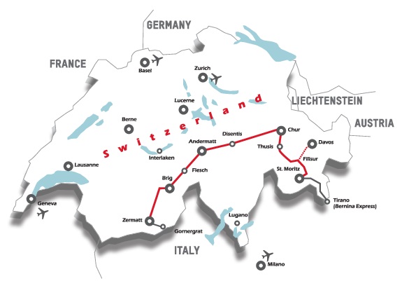 Glacier Express Fahrt von St. Moritz nach Zermatt und wieder zurück nach St. Moritz, Übernachtungen in St. Moritz und Zermatt mit Frühstück. Die Anreise/Rückreise nach/von St. Moritz erfolgt individuell.