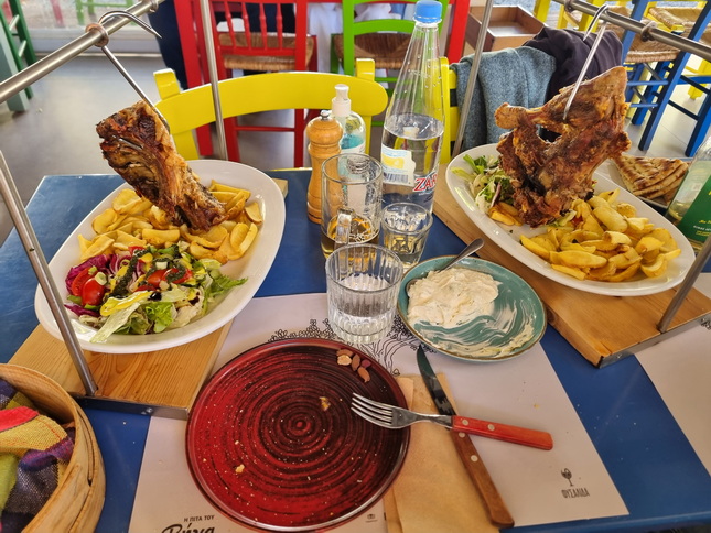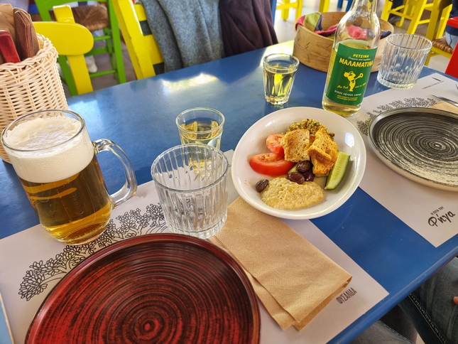 | Restaurant wenn man 2 Bier bestellt automatisch Vorspeise Dakos | Restaurant am Limmni Voulismeni aussicht auf Tauben |