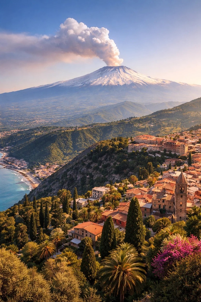 Der Ätna ist, mit einer Oberfläche von etwa 1.250 km2 und einer Höhe von etwa 3.350 m ü. d. M., der größte Vulkan Europas, und kann auch, im Bezug auf die sich in den letzten Jahren wiederholten Ausbrüche, als einer der weltweit aktivsten Vulkane bezeichnet werden. Von seiner Höhe aus herrscht er über Sizilien, über die drei Meere die die Insel umgeben und über Kalabrien. Der Ätna bietet vielfältige und eindrucksvolle Aspekte seiner Landschaft an, wie hunderte von Nebenkratern, spektakuläre Lavaströme, Wälder, Zitrusfrucht-anbauten und grüne Weinberge, die die naturwissenschaftliche Neugier und das touristische Interesse der Besucher aus aller Welt erwecken. Zwei moderne und nagelneue Autobahnen die Palermo und Messina mit Catania verbinden ermöglichen es den Ätna aus jeder Richtung in kurzer Zeit zu erreichen. Die Drahtseilbahn, oder anderenfalls die zur Verfügung gestellten speziellen Geländewagen, erlauben es die höheren Vulkanzonen zu erreichen für einen Ausflug der den Sommerurlaub bereichert und im Winter eine seltene, wenn nicht die einmalige Möglichkeit bietet nur wenige km vom Meer entfernt, Wintersportarten zu betreiben. Der Ausflug wird in den genehmigten Kraterzonen durchgeführt. Die erreichbare Höhe und der Ablauf des Ausfluges können sich gemäß den Genehmigungen der zuständigen Behörden ändern.