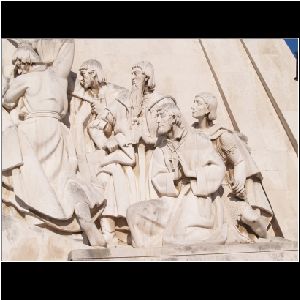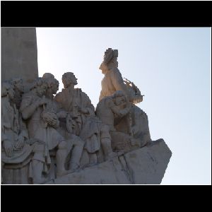 In den Tejo hinein schiebt sich der Bug eines Schiffes - selbstverständlich einer Karavelle - auf dem, angeführt von Heinrich dem Seefahrer, weitere berühmte Personen aus dem Zeitalter der Entdeckungen dargestellt sind. So folgen Heinrich, der an der Spitze steht, Manuel I, Vasco da Gama und Luis de Camões. Ein 54m hoher Turm, seitlich mit stilisierten Segeln versehen, symbolisiert den Mast des Schiffes. In seinem Innern befinden sich Konferenzsäle. Ein Fahrstuhl bringt Besucher auf die Aussichtsplattform im 7.Stock.