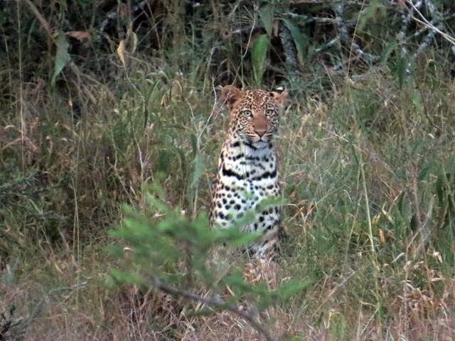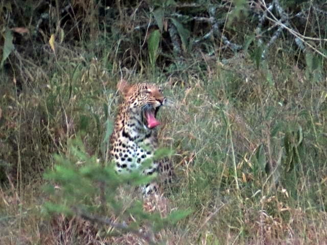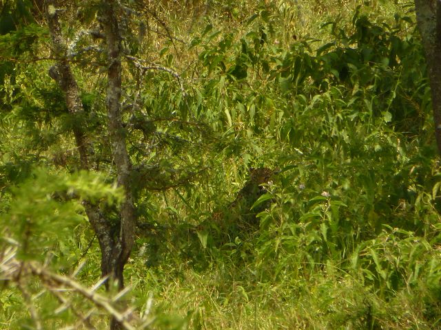 auch so eine Geschichte ……… nach 4 Stunden Fahrt Barabara Bunyoni to Mburo musste unser Fahrer auf die Buschtoilette , also anhalten im Nationalpark Mburo , neben einem Zebra Kadaver ca 25 m vom Weg . Er trat rechts vom Auto aus , bei Ihm sprang ein Wasserbock ins Gebüsch und ich trat links aus und beim pinkeln bemerkte ich , das bei dem Zebra sich ein Leopard davonschlich. Eingestiegen………dann sind wir dann mit dem Auto an den Leopardenbusch gefahren und der Leopard trottete gemütlich davon |
