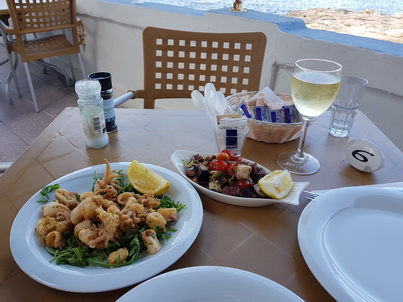 | Malta Gozo Comino Ray's Lido Little Armier Calamari fritti | Malta Gozo Comino Ray's Lido Little Armier Bay Oktopus Pulpo Salat |