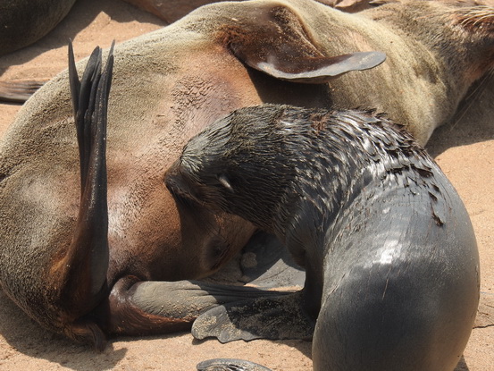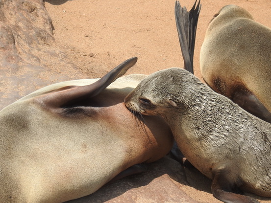| Cape Cross Robben Seals am Kreuzkap Namibia | Cape Cross Robben Seals am Kreuzkap Namibia junge Robbe säugt bei Mama |