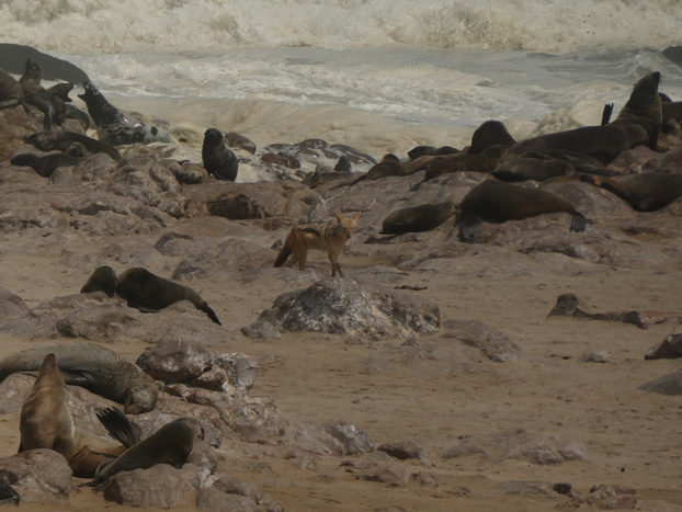 | Cape Cross Robben Seals am Kreuzkap Namibia | Cape Cross Robben Schakal sucht Futter |