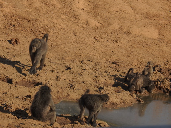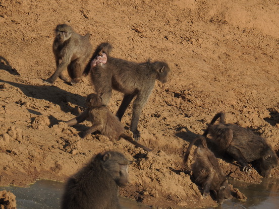 Gesicht und Verhalten: Bärenpaviane haben eine sehr ausdrucksstarke Mimik. Sie sind dafür bekannt, eine Vielzahl von Lauten zu erzeugen, von grunzenden Geräuschen bis zu Schreien, um sich in ihrer Gruppe zu verständigen oder um Gefahren anzukündigen.