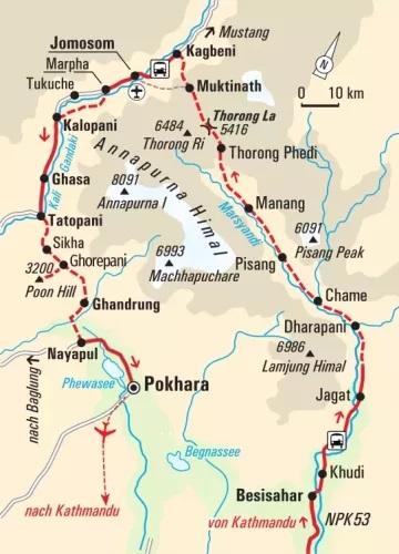 Deepest Gorge), tag 2 Kathmandu Hotel Nepal Tag 3: Fahrt zum Ausgangspunkt der Annapurna-Umrundung - Jagat Lodge Nepal Tag 4: Trekking nach Bagarchhap (2.160 m) ca. 7 Std. | Aufstieg: 970 m | Abstieg: 460 m | Gehstrecke: 15 km Jagat Lodge Nepal Tag 5 Wanderung bis nach Chame (2.670 m) 6 Std. | Aufstieg ca. 910 m | Abstieg ca. 320 m | Gehstrecke: ca. 12 km Lofge Nepal Tag 6 Weiter bis Upper Pisang (3.300 m) 6-7 Std. | Aufstieg ca. 860 m | Abstieg ca. 250 m | Gehstrecke ca. 13 km Lodge Nepal Tag 7: Über den Höhenweg nach Ngawal (3.660 m) 4-5 Std. | Aufstieg ca. 640 m | Abstieg ca. 220 m | Gehstrecke ca. 9 km Lodge nepal Tag 8: Trekking bis Manang (3.540 m) Gehzeit ca. 4-5 Std. | Aufstieg ca. 210 m | Abstieg ca. 300 m | Gehstrecke ca. 10 km Tag 9 Akklimatisationstag in Manang Sie können zurück nach Braga laufen und von dort hinauf zum 4.625 m hohen Ice Lake steigen. Von hier bieten sich ein weiteres Mal fantastische Ausblicke auf alle Gipfel von Pisang Peak bis zum Tiilicho Peak (7.134 m). Die Tagesplanung besprechen Sie einfach vor Ort mit Ihrem Guide. Tag 10: Aufstieg Richtung Thorong La Pass - Yak Kharka (4.050 m) Gehzeit ca. 4-5 Std. | Aufstieg ca. 640 m | Abstieg ca. 60 m Tag 11: Wanderung bis zum Basecamp des Thorong La Pass - Thorong Pedi (4.525 m) Gehzeit ca. 4-5 Std. | Aufstieg ca. 620 m | Abstieg ca. 80 m | Gehstrecke ca. 7 kmTag 12: Überschreitung Thorong La (5.416 m) & Abstieg Muktinath (3.760 m)Tag 13: Besichtigung Tempelanlage Muktinath & Abstieg nach Kagbeni (2.810 m)Tag 14: Fahrt bis Tatopani & Aufstieg nach Shikha (1.935 m)Tag 15: Wanderung nach Ghorepani (2.880 m)Tag 16: Besteigung Poon-Hill (3.210 m) & Wanderung bis Tadapani (2.630 m)Tag 17: Endpunkt des Trekkings Ghandruk (1.940 m)Tag 18: Fahrt nach Pokhara & FreizeitTag 19: Flug nach Kathmandu & Stadtbesichtigung