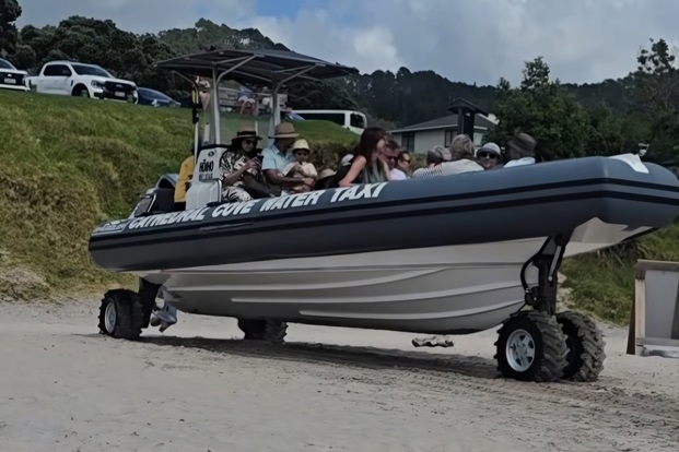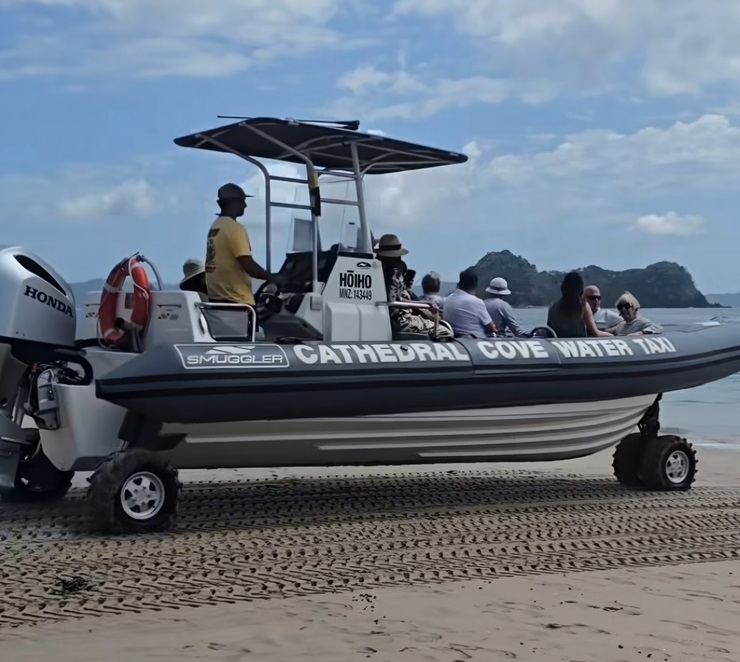 watertaxiboat Das Cathedral Cove Water Taxi ist die einzige Bootsfahrt auf den Sand der Cathedral Cove. Nutzen Sie die seltene Gelegenheit, Cathedral Cove in kleiner Runde zu besichtigen. Genießen Sie das Beste aus beiden Welten. Sehen Sie Cathedral Cove vom Boot aus und lassen Sie sich am Strand absetzen. Amphibisches Schlauchboot 7.1 M