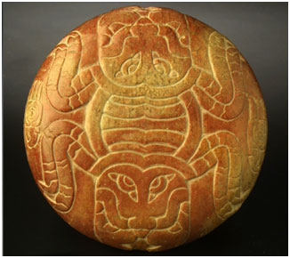 | Negative Malerei muss das Produkt von Fehlversuchen und Experimenten werden; vielleicht die Chance, spielte auch eine Rolle. Es wird verwendet, um Leugnung dieser Malerei und Dekoration zeigen, wird bichrome Typ als das Produkt von einer oberen Stufe, die den Aufstieg des kulturellen Entwicklungszeit vorausgeht verstanden. | Dieser kleine Steinblock wurde sehr sorgfältig und mit Liebe zum Arbeitsgoldschmied dorfebre gearbeitet und anbeten mit einem Priester amtieren. Betont die Harmonie der Komposition, Symmetrie Körper eine Spinne und die Fähigkeit für das Bild der Außenfläche dieser zeremoniellen Schale vollständig ausfüllt. |