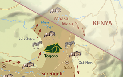 Senergeti NP Serengeti Togoro camp Das Camp mit 14 Zelten ist auf der Spitze eines Hügels errichtet, was einen unglaublichen Blick auf die Umgebung ermöglicht. Die Zelte verfügen über ein eigenes Duschbad mit Warmwasser und eine eigene Toilette, alles in einem eleganten und authentischen Ambiente. Alle sind mit einem Strohdach gedeckt, um auch in den heißesten Jahreszeiten eine angenehme Temperatur zu halten. Die Landschaft ist wunderschön unberührt und die Tierwelt das ganze Jahr über sehr reich und vielfältig. Die große Migration findet in der Regel von Juni bis Juli und von Oktober bis Dezember statt.  Serengeti National Park