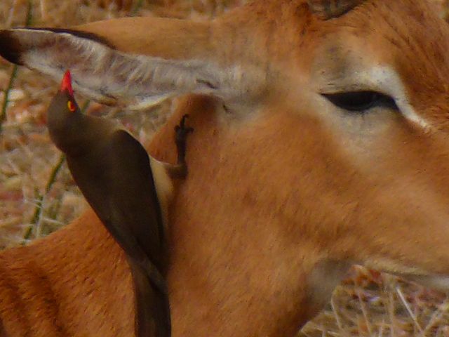 Swalah Impala Impalaantilope mit Oxpecker Ohrflüsterer Oxpecker Gazellenflüsterer