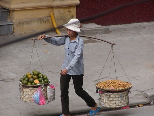 Handeln und Verkaufen in Altstadtstrassen von Hanoi im Gleichgewicht