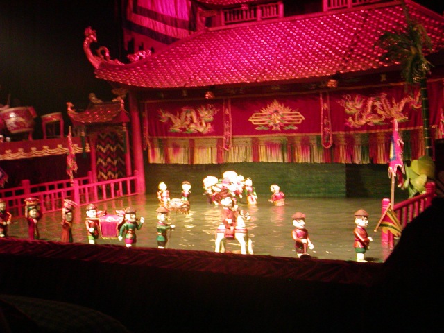 Die Spieler stehen hinter dem Vorhang bis zum Baunabel im Wasser und an langen Bambusstangen sind die Figuren befestigt.