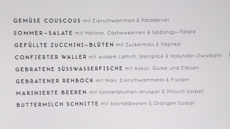 Buchweizen-Waffel 10,50 SOMMER–SALATE mit Melone, Cashewkernen & Saiblings–Tatare 11,50 GEFÜLLTE ZUCCHINI–BLÜTEN mit Zuckermais & Paprika 11,90 / 14,90 CONFIERTER WALLER mit wildem Lattich, Steinpilze & Holunder-Zwiebeln 14,90 / 18,90 GEBRATENE SÜSSWASSERFISCHE mit Kokos, Gurke und Erbsen 17,90 GEBRATENER REHBOCK mit Mais, Eierschwammerln & Fisolen 19,50 MARINIERTE BEEREN mit Sonnenblumen-Knusper & Pfirsich Sorbet 8,50 BUTTERMILCH SCHNITTE mit Stachelbeeren & Orangen Sorbet 8,50 |