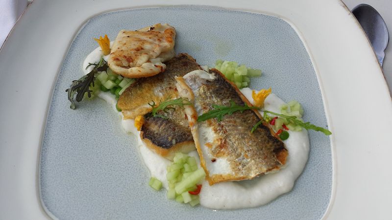 | wien Steirereck Meierei SOMMER–SALATE mit Melone, Cashewkernen & Saiblings–Tatare | wien Steirereck Meierei GEBRATENE SÜSSWASSERFISCHE mit Kokos, Gurke und Erbsen |