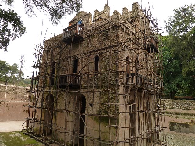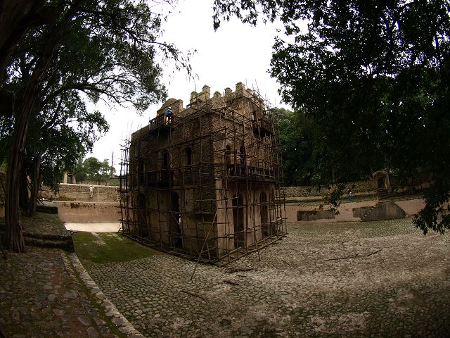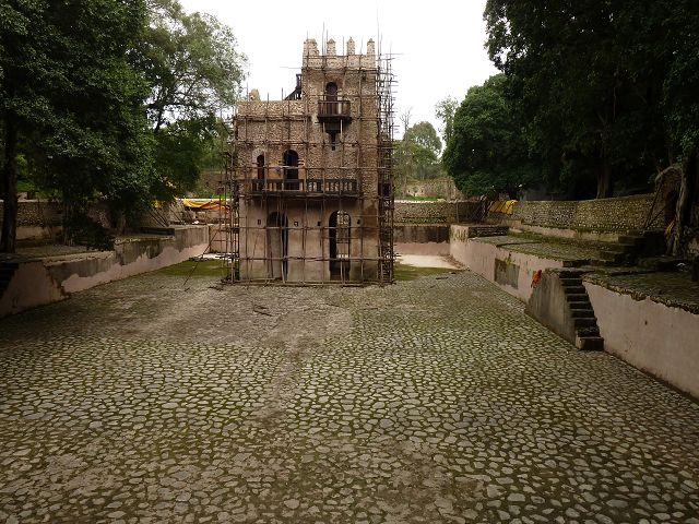 | In einem ummauerten Garten befindet sich das Bad des Fasiledas. Mitten in einem 70 x 40 m großen, tief ausgemauerten Bassin steht auf steinernen Füßen ein kleines Palais, von dem aus der Kaiser und seine Nachfolger in das kühle Nass stiegen.Es wird jedoch ein Mal im Jahr gefüllt und das Wasser gesegnet. Das kleine Palais ist zurzeit eingerüstet und soll restauriert werden . | . Etwas außerhalb liegt ein kleines Wasserschloss, das Bad des Fasiledes .Palastbezirk Fasil Ghebbi Kloster Debre Berhan Selassie,Bad des Fasilidas Witwensitz „Kusquam“ der Kaiserin Mentewab |