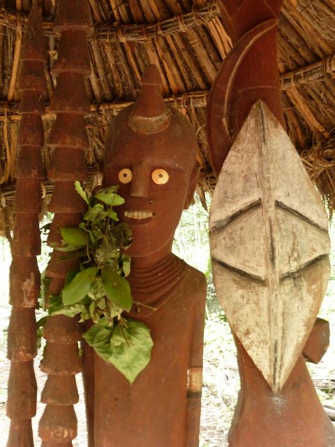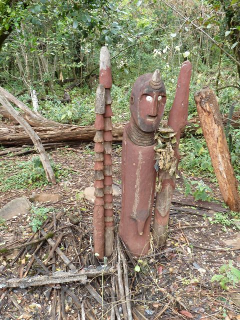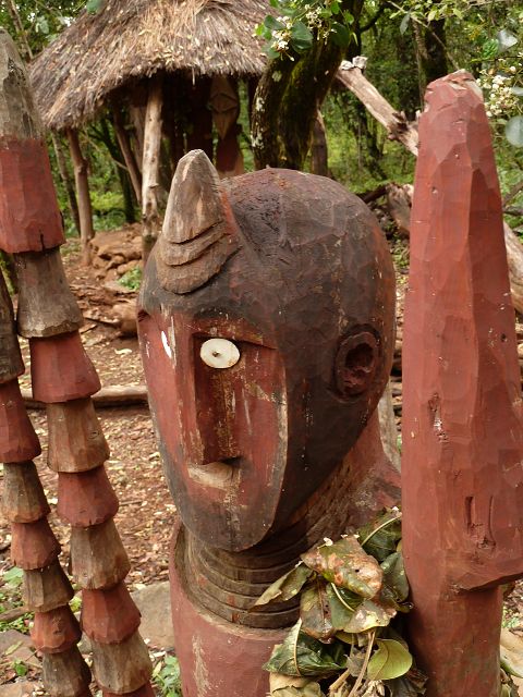 | Der König wird nach dem Tode einbalsamiert und dann wird der Verstorbene 9 Monate und 9 Wochen und 9 Tage und 9 Stunden im Dorf in einer speziellen Hütte aufbewahrt und mumifiziert und dann beigesetzt mit Totem. | Die Konso sind die Erbauer von Wagas, Denkmal-Statuen für einen toten Häuptling , Diese stilisierten Holzschnitzereien sind in Gruppen angeordnet und zeigen den Konsohäuptling mit seiner Lieblingsfrau |