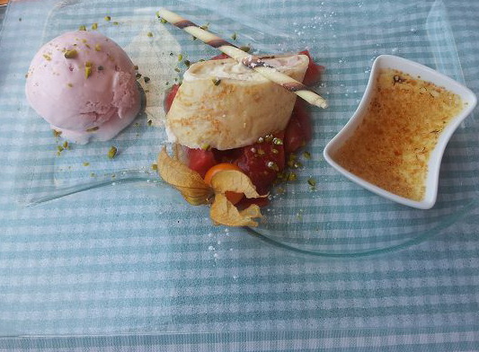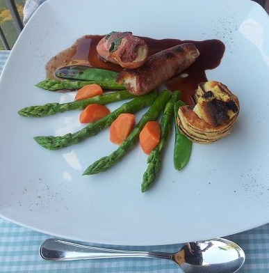 | Rebhuhn im Speckmantel mit Kartoffelbaumkuchen | Himbertsorbeteis mit Spargelbrulee + frischer Rabarber |