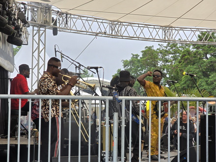 Santrofi (Ghana) Santrofi ist eine kürzlich gegründete Band aus Ghana, die klassisches Highlife spielt. Die Gruppe besteht aus jungen Musikern aus Accra unter der Leitung des Bassisten Emmanuel Ofori (bekannt von Pat Thomas & Kwashibu Area Band & Ebo Taylor). Sie sind ein Haufen turbulenter Multitalente, die dem alten Highlife, das im letzten Jahrhundert entstanden ist, einen starken zeitgenössischen Impuls verleihen. Rhythmen, Melodien und verschiedene Sprachen fließen nahtlos zusammen, mehrere Gitarren, groovige Basslinien, traditionelle ghanaische Perkussion, einzigartige Bläserarrangements und harmonische Background-Stimmen sorgen für einen aufregenden, swingenden und frischen Sound. Die Band hat mehrere Sänger, die abwechselnd als Leadsänger auftreten, aber auch die anderen Musiker wechseln während des Konzertes ständig die Instrumente. Es scheint chaotisch zu sein, aber es ist eine streng geplante Show. |