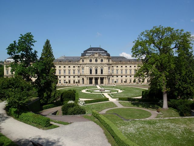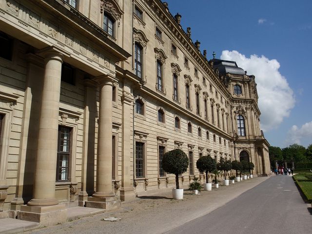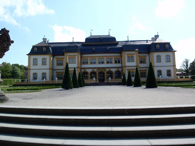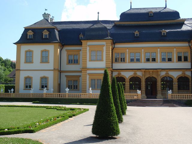 Das erst als Jagdhaus, dann als Sommerresidenz genutzte Schloß im Hofgarten wurde 1680/82 unter Fürstbischof von Dernbach errichtet und 1749/53 durch Balthasar Neumann erweitert. Im Inneren führt eine von Balthasar Neumann geschaffene Treppe in den ersten Stock zu den Wohnräumen, die weniger repräsentativen Zwecken als vielmehr dem privaten Aufenthalt dienten. Die Ausstattung der fürstbischöflichen Wohnräume und der Toscanaräume des frühen 19. Jahrhunderts ist erhalten. |