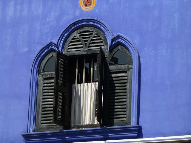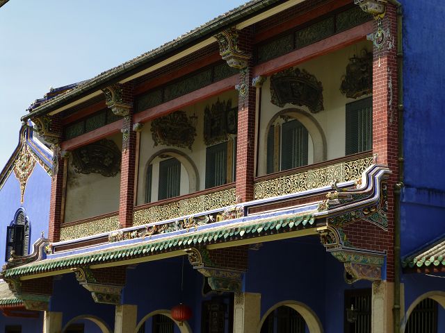 | Penang Georgetown Cheong Fatt Tze Mansion Georgetown - In den Häusern der malaysischen Insel Penang Hier hatte die Frau ... die Nyonya-Matrone die Trousers an. Sie hatten in ihrem Haus einen eigenen Salon zum Kartenspielen. Die Zahlenden Gäste gaben Ihr schon vor der Hochzeit einen Silbergürtel. Er sollte ziemlich lang sein Damit Sie viele Kinder haben können . Die Nyonyas konnten dann das Silber heraustrennen + ihre Spielschulden begleichen | Penang Georgetown Blue Mansion Haus eines chinesischen Händlers heut Museum |