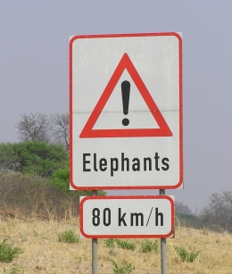 Schild im Chobe Nationalpark Achtung Elefantenwechsel  Speed reduce