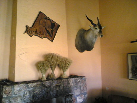 | Kambaku Safari Lodge Lederlogo + ElandanderWand | Kambaku Safari Lodge Pool mit Blick auf Wasserloch |