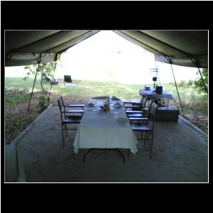 Das Shinde Tentcamp liegt an einem Flussarm des Okavango unter großen Leberwurstbäumen , ca.50 min mit dem Toyota je nach