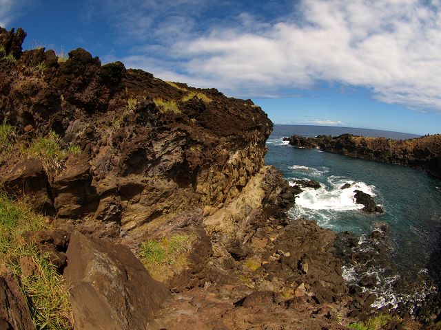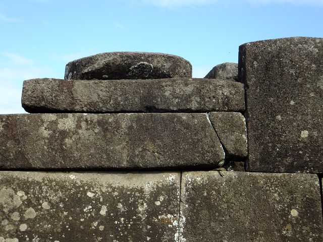 | Eine kleine ahu durch den Abgrund der Punta Atu o Puna zeigt die Lage der Maitaka Te Moa, ein ahu mit großer Felsen gebaut. Die Wände umschließen einen Moai aus der ersten Periode, die als integrierte Teil der Wand verwendet wurde. In der Nähe dieser Stelle finden wir die Vai Mata Ebene, die reich an archäologischen Überresten ist. Einer von ihnen bleibt, ist ein sehr einfach zu Höhle, nachträglich mit Blöcken von Steinen, die aus shiphouses kam erbaut wurde. Nicht weit von dort, finden wir den Grundstein für eine interessante shiphouse, mit einer Grundfläche von runden Steinen aus dem benachbarten ahu gewonnen wird. Laut Überlieferung gab Frauen Geburt an diesem Ort, und ihre Babys nahmen ihre erste Bad in einem Behältnis in einem pukao geschnitzt und begraben in rotem Tuffstein. Der Name dieses Ortes kommt aus diesem Brauch, da Vai Mata bedeutet wörtlich "Wasser Augen". A 6 m hohen Moai in sehr gutem Zustand war nach 100 m entfernt von der ahu, wo es bestimmt, gelegt werden sollte, nach der Überquerung der ganzen Insel klopfte. Wie die Vinapu, ist dies ahu Struktur Doppel und komponiert von zwei "Inca-Stil" Wandstrukturen, zweifellos die fabelhafte auf der Insel. | |
