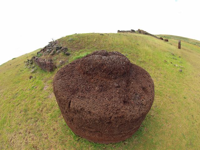 Te Puna Pau Ist der Ort, wo die große Brötchen, dass die Moai abgedeckt extrahiert und waren bereit (die meisten von ihnen haben nicht mitnehmen). Die alten Inselbewohner geöffnet diesem Steinbruch nachträglich in eine der vielen zufälligen Kegeln der Insel. Die roten Felsen verwendet, um die pukao machen ist sehr weich, da sie durch vulkanische Schlacke gebildet wird. Die eigentliche Schwierigkeit der Bildhauer konfrontiert wurde extrahiert diese Hüte aus dem Krater, und besonders, rollte sie über sorgfältig, um sie ohne Beschädigung zu transportieren. Viele glauben, dass aufgrund des Fehlens von Instrumenten wie Kräne, wer die Moai erstplatzierten der pukao auf ihren Köpfen, und dann hob er den ganzen Satz mit einem System, das aus häufen Steine und mit Hebeln bestand aufgehoben. Heyerdahl führte das Experiment in Anakena im Jahr 1956. Das Gewicht des pukao reichte von 9 bis 12 Tonnen. | |