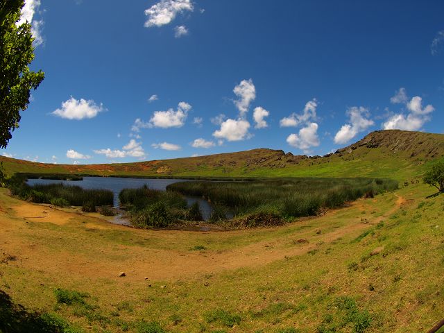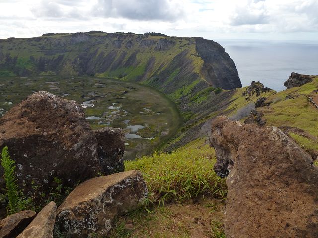 Rano Kau Rano Kau hat einen Kratersee, die man von der Insel nur drei natürlichen Körper mit frischem Wasser. Die meisten der Vulkan liegt an der Küste und wurde zurück auf hohe Klippen, die an einer Stelle begonnen, in der Kraterwand Biss Form erodiert. Auf seiner Nordseite, Hänge des Vulkans hinunter zu Mataveri International Airport. Rano Kau ist in das Weltkulturerbe der Rapa Nui National Park und seinen Namen zu einem der sieben Abschnitte des Parks. Die wichtigsten archäologischen Stätte am Rano Kau ist die Ruine zeremoniellen Dorf Orongo, die an der Stelle, wo das Meer Klippe und inneren Kraterrand konvergieren befindet. Ein ahu mit mehreren Moai wurde auf den Klippen von Rano Kau in den 1880er Jahren aufgenommen, hatte aber an den Strand bis zum Zeitpunkt der theRoutledge Expedition im Jahr 1914 gesunken. Neben Basalt, enthält es einige andere magmatische Gesteine, einschließlich Obsidian (für die es eine der wichtigsten Quellen für die Insel Steinmetze war) und Bimsstein. Der Krater ist fast eine Meile breit und verfügt über eine eigene Mikro-Klima. Geschützt vor den Winden, die die meisten der Rest der Insel trocken, Feigen und Weinreben gedeihen auf Rano Kau | |