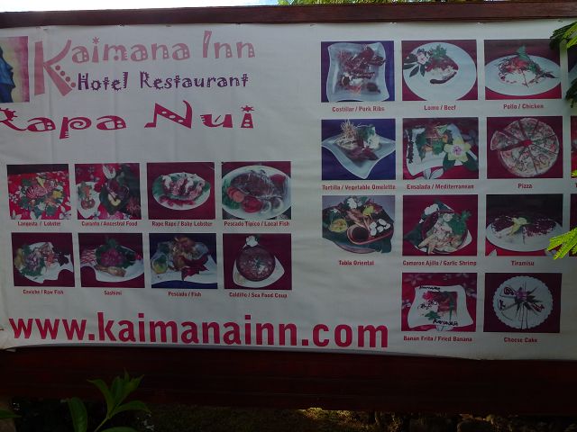 Restaurant Isla de Pacua Restaurant Easter Islland Restaurant Osterinsel https://www.kaimanainn.com Ariki o Te Pana 210-0171 Av Atamu Tekena 1200-8000 Monday to saturday Mikafé 255-1059 Caleta Hanga Roa 1500-2500 All day Café Ra’a 255-1530 Av Atamu Tekena 4000-10000 All day Tataku Vave 255-1544 Caleta Hanga Piko 6000-8000 Monday to saturday Haka Nini 210-0918 Av Policarpo Toro 6000-8000 Monday to saturday Aloha Pub-Restaurant 255-1383 Av Atamu Tekena 6000-11000 Tuesday to saturday Kona Nehe Nehe 255-1677 Av Apina 6500-9000 Monday to sunday Merahi Ra’a 255-1125 Av Te Pito o Te Henua 7000-9000 Monday to sunday Haka Honu Av Policarpo Toro 8000-12000 Tuesday to saturday Te Moana 255-1578 Av Atamu Tekena 9000-15000 Monday to saturday Au Bout du Monde 255-2060 Av Policarpo Toro 9000-15000 wednesday to monday La Taverne du Pêcheur 210-0619 Av Te Pito o Te Henua 10000-47000 Monday to saturday Pea 210-0382 Av Policarpo Toro 6000- 8000 Thursday to tuesday Kanahau 255-1923 Av Atamu Tekena 6000-9000 Monday to saturday Kai Mana 255-1740 Av Atamu Tekena 6000-19000 Monday to saturday | |