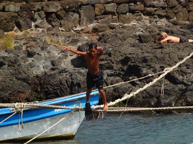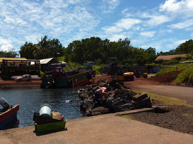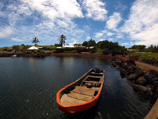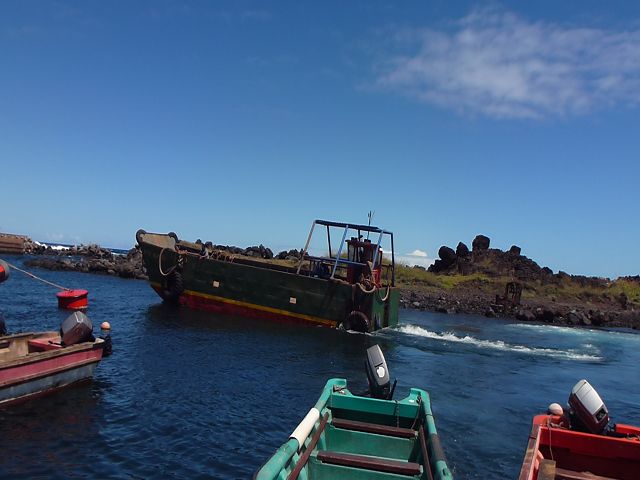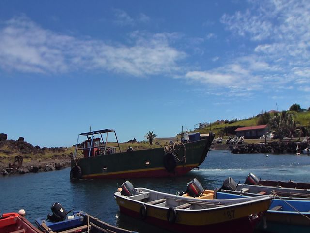 | Isla de Pascua Osterinsel - Rapa Nui Plattboot wird zu Wasser gelassen | Easter Island Isla de Pascua Osterinsel - Rapa Nui Hafenbecken |