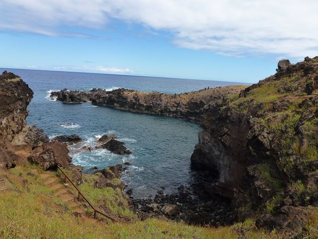 | Easter Island Isla de Pascua Rapa Nui Moai Lavahoehle am Meer Ana Kaitangata | Easter Island Isla de Pascua Osterinsel - Rapa Nui Moai Abstieg zur Lavahoehle |