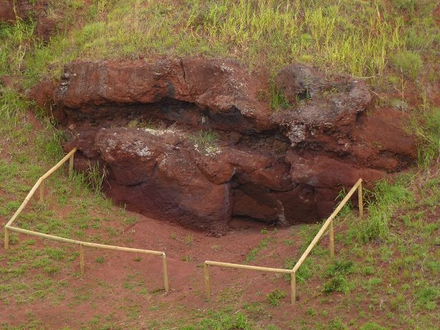 Steinbruch Pukao Hutfabrik Puna Pau Viele Moai haben einen großen roten Steinklotz auf dem kopf Ein Pukeau oder Pzkao - also es stellt die langen Haare dar,die auf dem Kopf zu einem Knoten gebunden werden. Wie auf Haiti tragen auf Rapa Nui Jungs und Mädels noch lange Zöpfe |