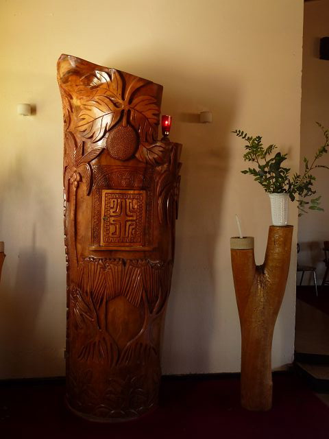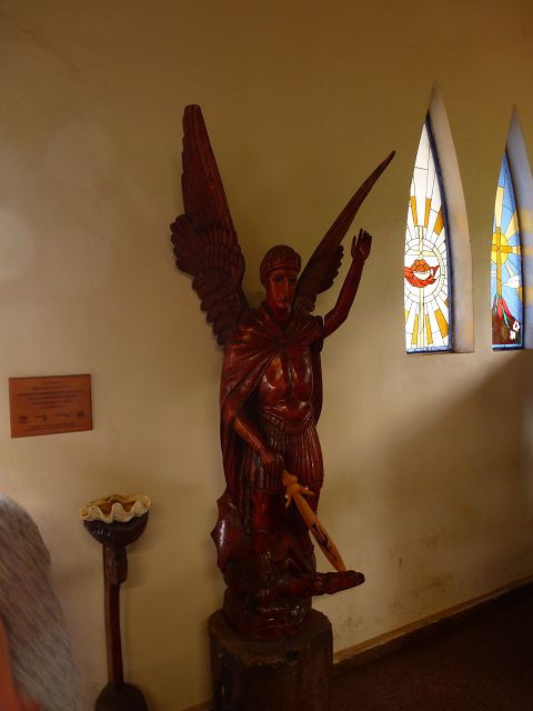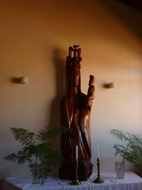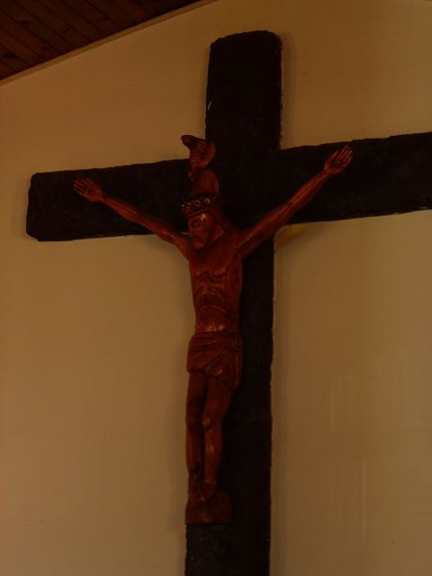 | Marienstatue mit Vogelmann auf dem Kopf Hanga Roa Kirche Iglesia Santa Cruz | Christus mit Vogelmann auf dem Kopf |