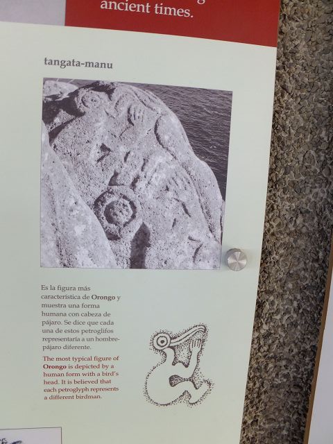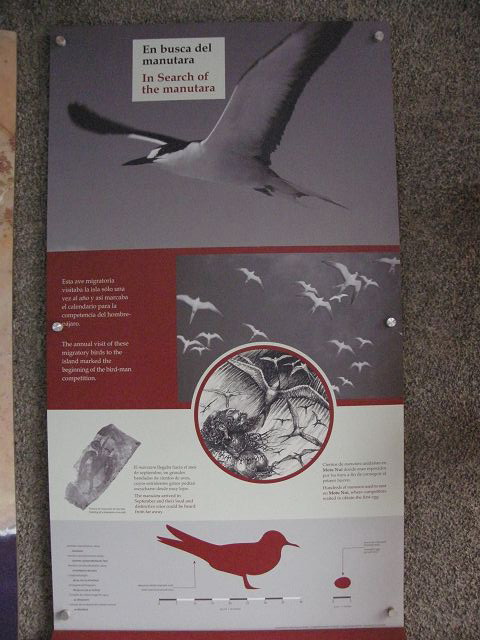 | Easter Island Isla de Pascua Osterinsel Rapa Nui Bilder in der Austellung Das ist die Möwe Manutara Tropikvogel , der auf den Motus brütet und wo die Eier als Ritual dann erschwommen werden müssen. | Easter Island Isla de Pascua Osterinsel Rapa Nui Pictures at an Exhibition |