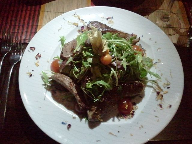 Boerewors Südafrikanische Bratwurst Handwarme Sußkartoffeln mit Ricottakäse,  gebratenen Springbockstreifen, Kirchtomaten, Pinienkernen und Mangodressing