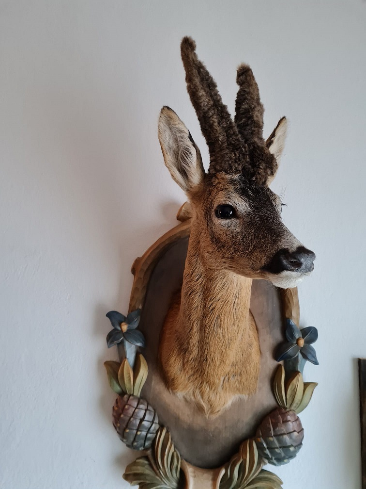 | Perückenbock Präparat männlciher Rehbock mit Hornmissbildung durch Hormonstörung Ausfall Testosteron nicht mehr Hornbildung möglich |