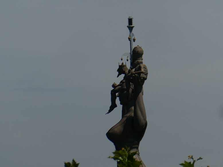 Auf ihren ausgestreckten Händen hält sie zwei zwergenhafte, nackte Männchen: eine Figur mit Kaiserkrone und Reichsapfel (weltliche Macht) und eine mit Papsttiara (geistliche Macht) Das Konstrukt steht auf einem Drehtisch, der sich einmal alle vier Minuten um die eigene Achse dreht