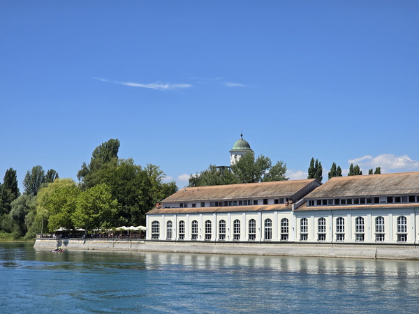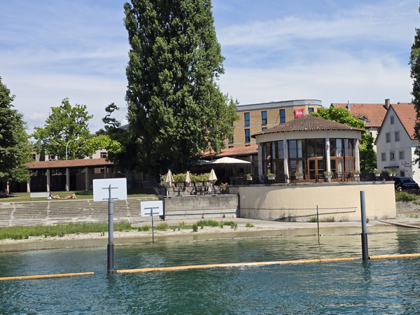 | Mit Boot zurück nach Konstanz auf dem Rhein Bodensee Rheinterasse | Mit Boot zurück nach Konstanz auf dem Rhein Bodensee Constanzer Wirtshaus |