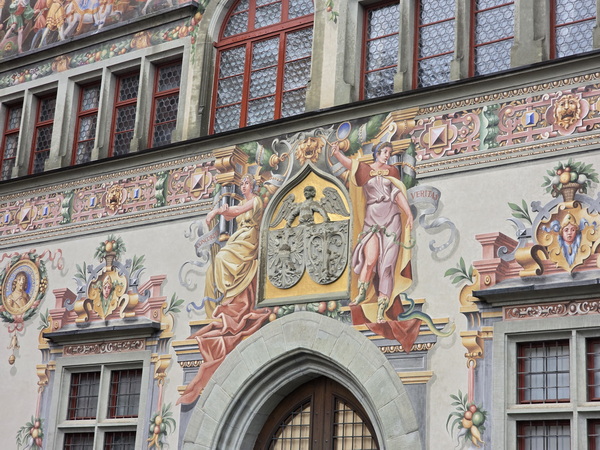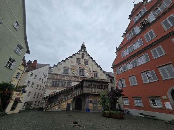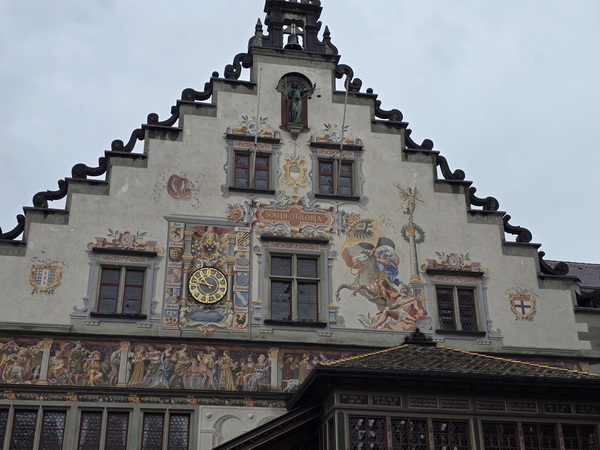 • Die Südfront beeindruckt mit aufwändiger historisierender Fassadenmalerei aus dem 19. Jahrhundert, die Szenen aus Lindaus Geschichte erzählt. Diese wurde umfassend 1972–1975 renoviert