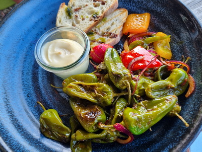 Piementos de Padron  Pimientos de Padrón | Kalamata Oliven | Röstbrot | Dip 12 Pimientos de Padrón | Kalamata Olives | Roasted Bread | Dip Loup de Mer Loup de Mer | Auberginen Salsa | Zucchini Gemüse | Kartoffelstampf 31 Loup de Mer | Eggplant Salsa | Zucchini Vegetables | Mashed Potatoes
