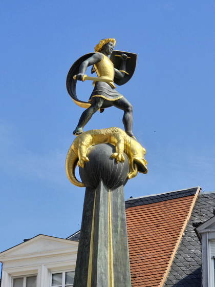 | Denkmal für die Gefallenen des Ersten Weltkriegs Das Denkmal in der MaximilianstraßeDie Maximilianstraße ist eine der ältesten Straßen der Stadt Speyer und diente seit ihrer Anlage im 11. Jahrhundert sowohl als Durchgangsstraße als auch als Ort des Marktes und der Münze. So findet man dort heute noch die historischen Grundrisse alter Wohn- und Verkaufshäuser aus dem Mittelalter, Bauformen aus dem Barock wie beispielsweise das alte Rathaus und Giebelbauten des Patriziats aus dem 19. Jahrhundert. Ebenfalls in Mitten dieser abwechslungsreichen Straße – die von den Bürgern der Stadt auch Hauptstraße genannt wird – trifft man auf ein herausragendes Denkmal für die Gefallenen des Ersten Weltkrieges. Es befindet sich vor der ehemaligen Münze auf dem Platz des Alten Marktes und wurde erst 1930, nach Ende der französischen Besatzungszeit, dort angebracht. Es handelt sich um einen achteckigen Brunnentrog aus Muschelkalk, in welchem sich eine emporgehobene Bronzeschale befindet. Auf einem mittig platzierten und zum Teil vergoldeten Pylon sieht man außerdem die Statue des Heilige Georgs in seiner Rolle als Drachentöter. Die Inschrift an der Vorderseite des Brunnens charakterisiert das prominent plazierte | text von https://www.regionalgeschichte.net/ |